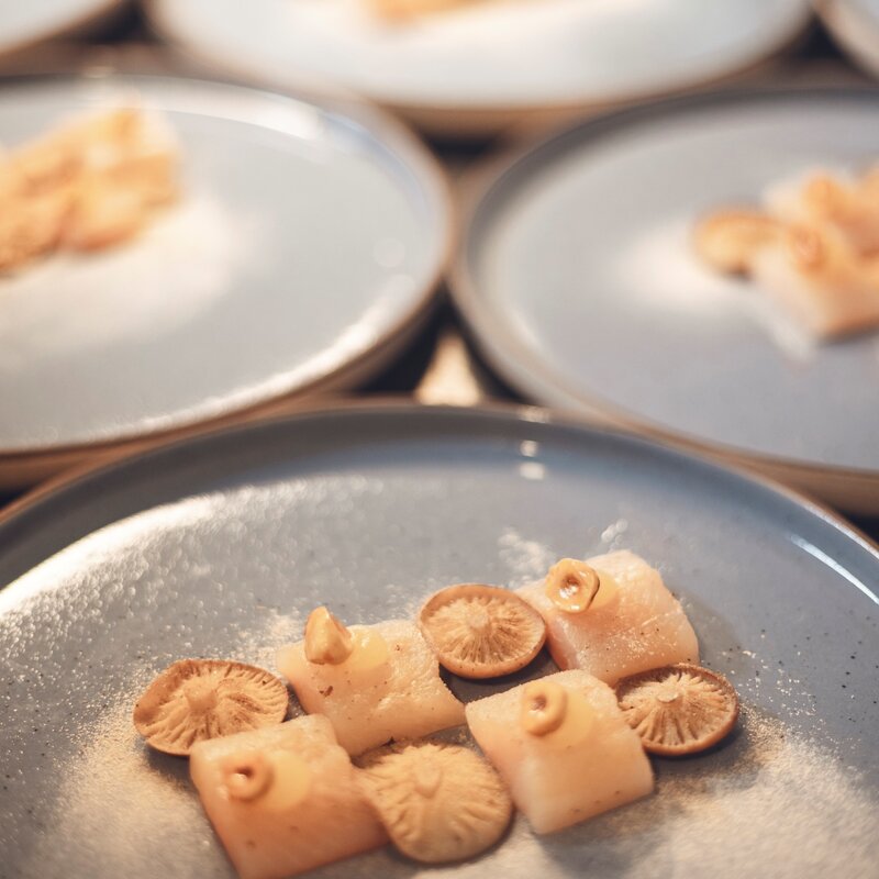 Prendere una tazza da cappuccino. Adagiare un cucchiaio di bocconcini di trota affumicata sul fondo della tazza, coprire con la spuma di patate e una spolverata di polvere di olive. Accompagnare con una chips di polenta.
