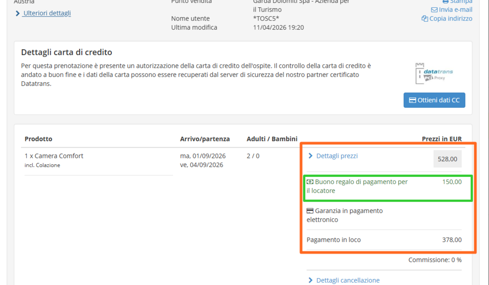 Sotto alcune immagini, una in cui si evidenzia una prenotazione di un alloggio con Buono Regalo, dove trovate l'indicazione nel pdf della prenotazione, che arriva via email; una con il dettaglio nel webclient, le altre sono fac-simile dei vari Vouchers fra cui quelli a tema dei nostri Top Events (nel caso specifico Rock Master e Bike Festival).